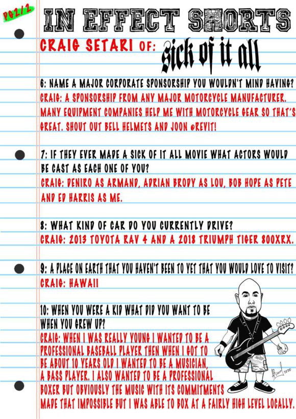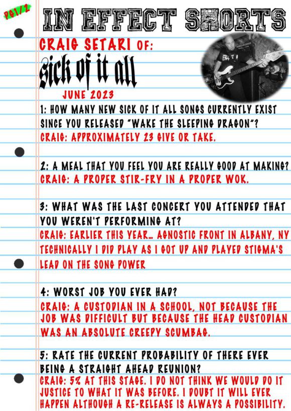 IN EFFECT SHORTS IS A NEW FEATURE MAKING ITS DEBUT WITH CRAIG SETARI, BASSIST FOR LEGENDARY NYHC BAND SICK OF IT ALL